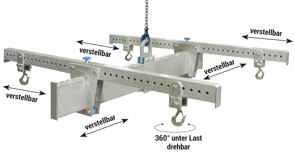 - mit vier verstellbaren Sicherheitslasthaken, die unter Last um 360° drehbar sind