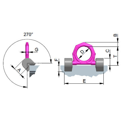 | Name | WLL in t | A in mm | B in mm | C in mm | D in mm | E in mm | F in mm | G in mm | Schweißnaht | T in mm | Gewicht/Stk in kg |