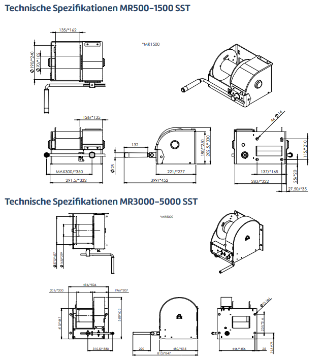 - Gehäuse, Trommel, Kurbel und alle ausgehenden Teile komplett aus Edelstahl 316